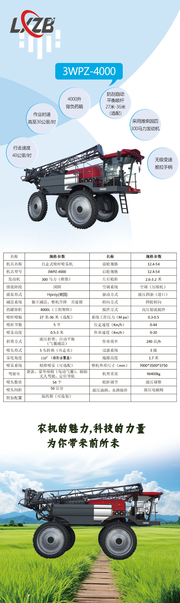 3WPZ-4000?噴藥切頂及一體的全液壓噴桿噴霧機。這款機器行走速度可達40公里每小時。作業(yè)時速可高達30公里每小時3WPZ-4000這款車搭配4000升背負式藥箱;30米防刮氣囊減震噴桿,搭配5頭轉(zhuǎn)換進口噴頭。此機型采用濰柴國四排放標準300馬力發(fā)動機,ACE?757升流量進口泵,輪邊液壓驅(qū)動,進口液系統(tǒng)由PMP公司配套以及售后。