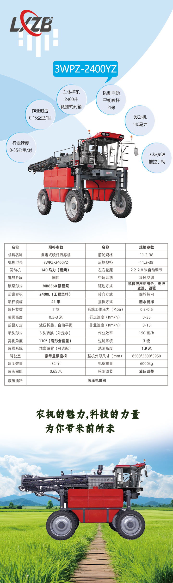 3WPZ-2400YZ是我公司生產(chǎn)的2400系列的高配車型,2400系列已經(jīng)生產(chǎn)銷售10余年;技術(shù)成熟可靠。行走速度根據(jù)不同路況可以達(dá)到0-35KM/H;作業(yè)速度根據(jù)作業(yè)環(huán)境可以達(dá)到0-15KM/H。3WPZ-2400YZ搭配2400升側(cè)掛式藥箱。21米防刮自動(dòng)平衡噴桿。五頭轉(zhuǎn)換美國(guó)噴頭。此機(jī)型采用錫柴國(guó)四排放標(biāo)準(zhǔn)140馬力發(fā)動(dòng)機(jī)。MB6360隔膜泵,機(jī)械液壓相結(jié)合的傳動(dòng)方式。機(jī)械液壓相結(jié)合的傳動(dòng)方式是立興打藥機(jī)的獨(dú)有技術(shù),已經(jīng)在10余種機(jī)型,2000多臺(tái)機(jī)器上配套使用,技術(shù)成熟可靠。