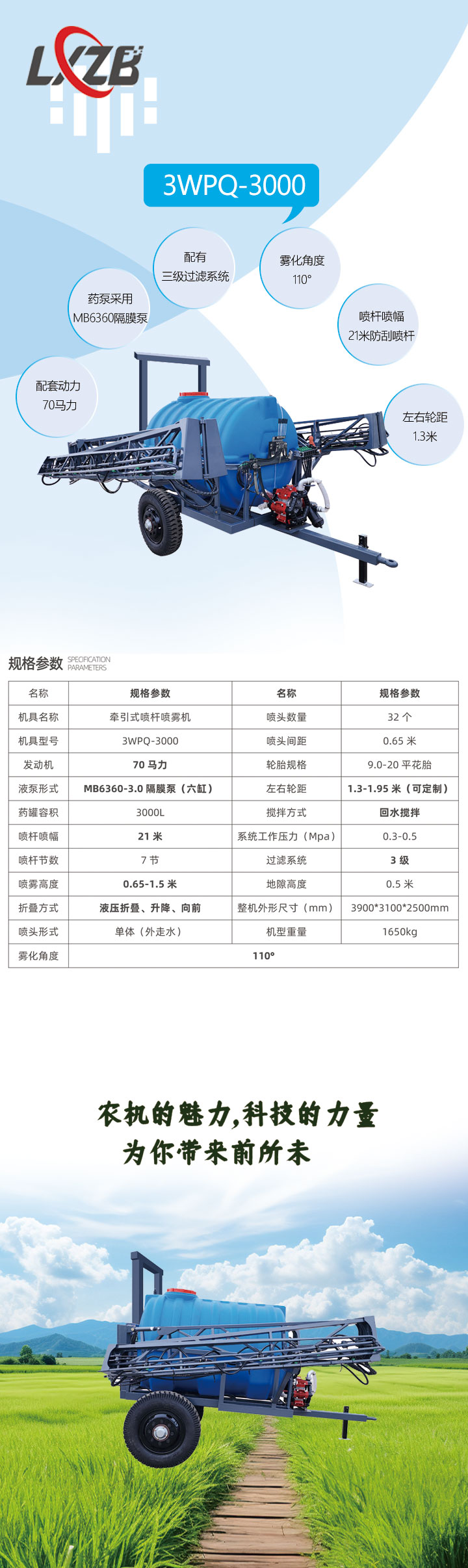 3WPO-3000牽引式噴桿噴霧機,配套動力270馬力,藥泵采用MB6360隔膜泵,配有三級過濾系統(tǒng),回水?dāng)嚢韫δ埽幭淙莘e3000L,噴桿噴幅21米防刮噴桿,噴霧高度0.65-1.5米,霧化角度110°,噴桿液壓折疊升降,左右輪距1.3米(可定制)地隙高度0.5米,適合中大型平原地塊噴灑作業(yè)需求。