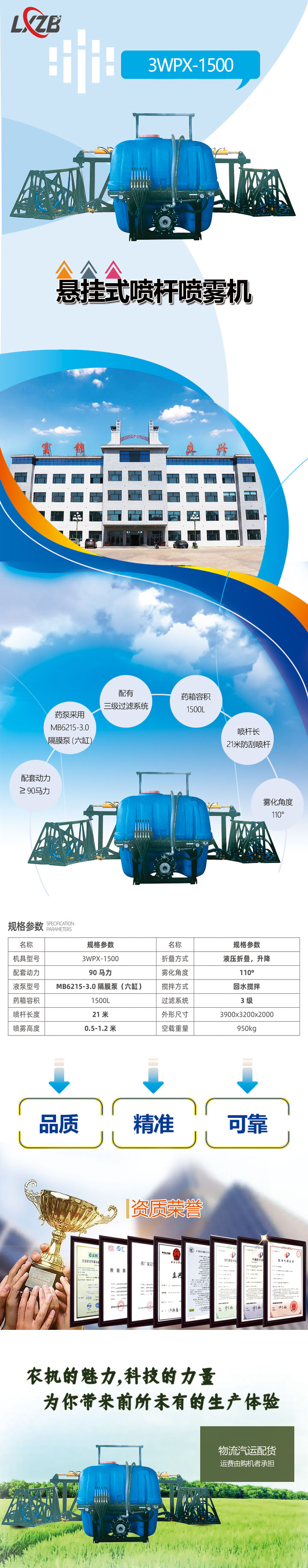 3WPX-1500懸掛式噴桿噴霧機配套動力290馬力,藥泵采用MB6215-3.0隔膜泵(六缸),配有三級過濾,回水攪拌功能,藥箱容積1500L,噴桿長21米防刮噴桿含有自動平衡,噴霧高度0.5米-1.2米,霧化角度110°,噴桿液壓折疊、升降,藥箱容積的提升,節省了加藥時間,噴桿的長度也增加了噴霧作業的效率。