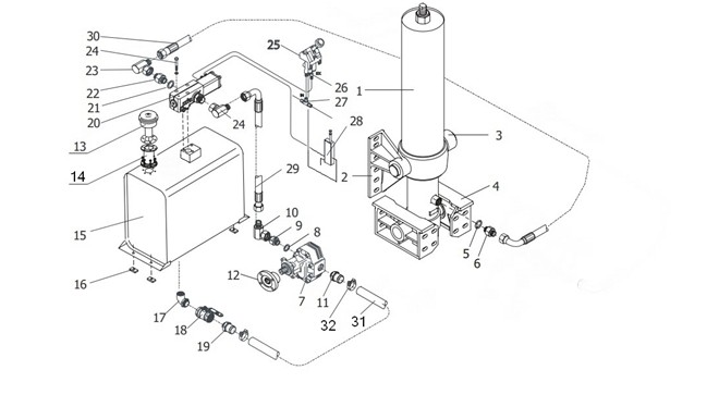 請按照上圖用油管和氣管將全部液壓元件連接進來。確保油管(軟管)長度足夠長,以免在舉升過程妨礙油缸的運動。組裝完成后沒有必要立即將氣體從油缸中排出,因為通過最初的幾" />